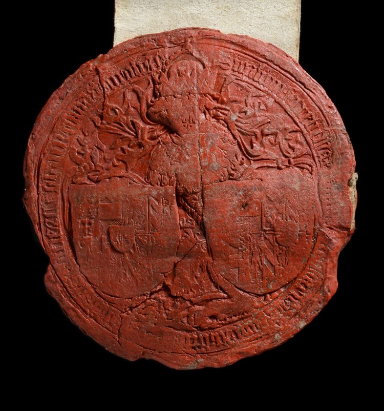 2. De positie van de Bourgondische erfprinses Maria was precair na de plotse dood van haar vader Karel de Stoute (beluister aflevering 11). Een huwelijk met Maximiliaan van Oostenrijk moest haar positie versterken. De wijze waarop een oorkonde uit 1481 gevalideerd werd, is veelzeggend over de machtsverhoudingen en hoe vrouwelijk gezag moeizamer een plaats kon opeisen. De akte betreft de aanstelling door het koppel van gevolmachtigden die moesten bemiddelen over een alliantie met de hertog van Bretagne. Merk op hoe de akte gevalideerd werd met de handtekening van Maximiliaan én Maria, maar enkel het zegel van Maximiliaan aangehecht kreeg.