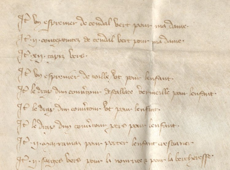 Een middeleeuwse geboortelijst?! Jonge en ook niet meer zo jonge ouders weten dat er bij de geboorte van een kind heel wat praktische zaken moeten geregeld worden. Zo’n kleintje heeft spullen nodig waarvan je vooraf zelfs niet wist dat ze bestonden. Tegenwoordig kunnen ouders daarvoor een geboortelijst aanleggen. In de middeleeuwen bestond dit gebruik uiteraard nog niet, maar toch dook in Rijksarchief Gent onlangs een stuk op dat er aan doet denken. Tijdens de bestandscontrole van de oorkonden van de graven van Vlaanderen uit de reeks Chronologisch Supplement (voorafgaand aan de restauratie volgend voorjaar) herontdekten we een wel heel leuk document. Het gaat om een ongedateerde lijst, die eind 14de – begin 15de eeuw moet worden gesitueerd, waarop vermeld staat welke zaken Guillemin, de kleermaker van de gravin van Vlaanderen, zal aankopen met het oog op de geboorte van een kind in de grafelijke familie. Afgaand op de datering kan het gaan om een kind van gravin Margaretha van Male (de echtgenote van Filips de Stoute) of gravin Margaretha van Beieren (de echtgenote van Jan zonder Vrees).