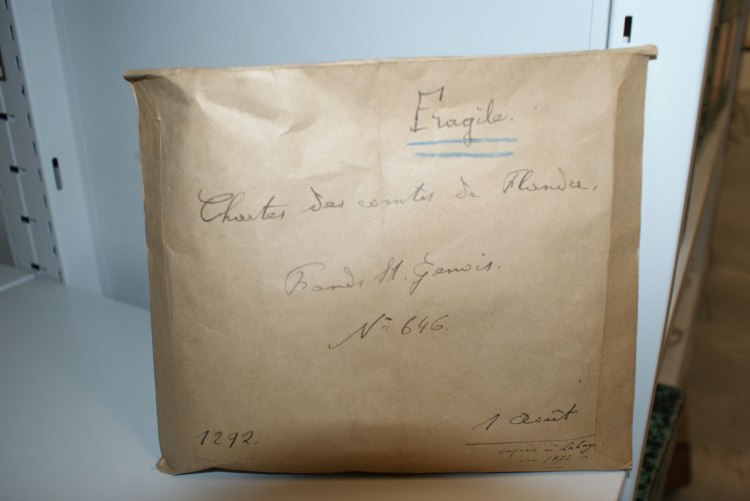 De ambitie is om de volledige chartercollectie van de graven van Vlaanderen die in Gent wordt bewaard (4.055 bestanddeelnummers) te laten droogreinigen, vlakken, indien nodig herstellen en herverpakken in aangepast materiaal op maat van de stukken. Zoals de foto’s illustreren is op het vlak van verpakken een sprong van de 19e naar de 21e eeuw absoluut noodzakelijk…