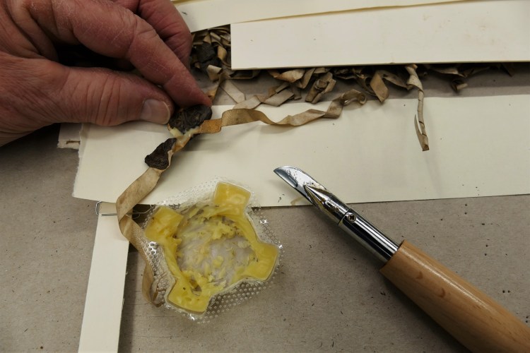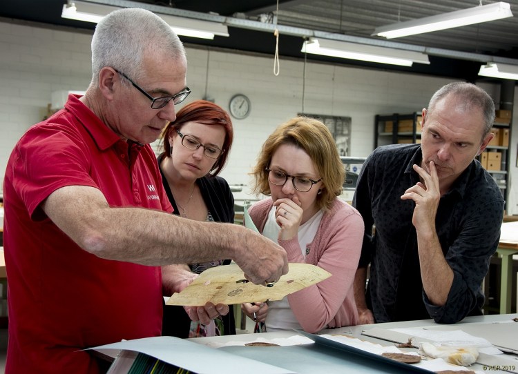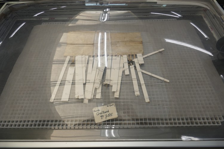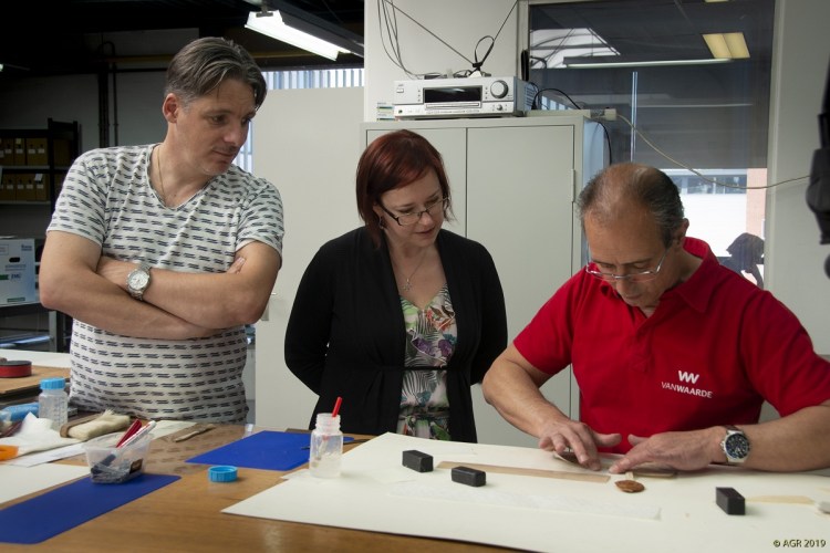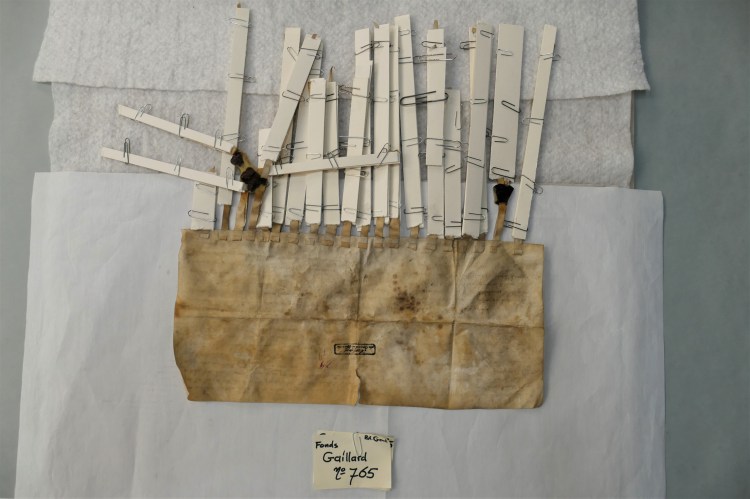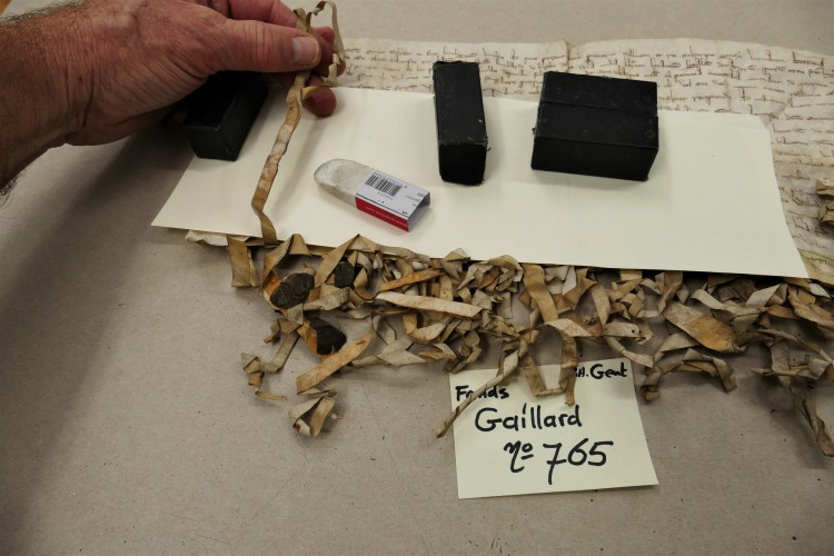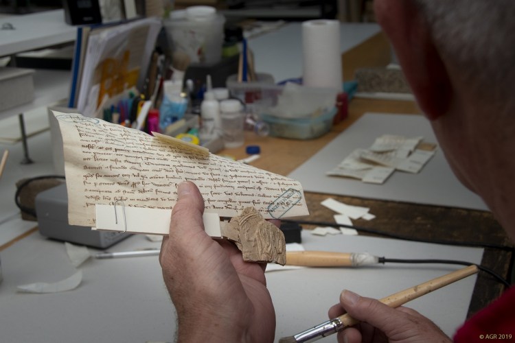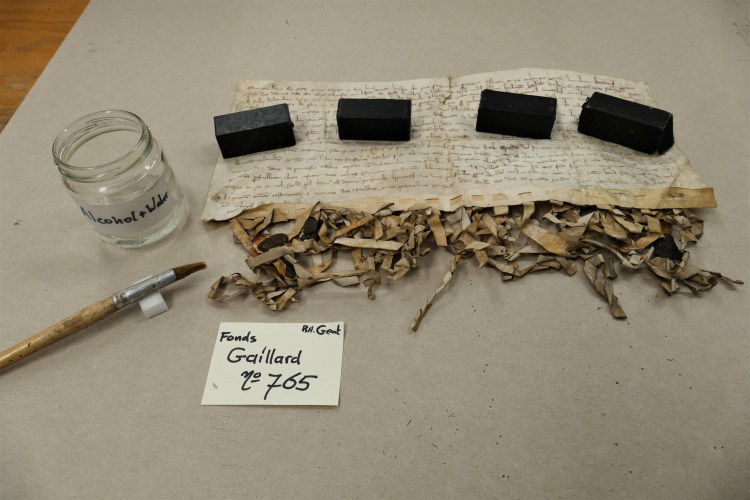 Intussen zijn we een half jaar verder, en is er heel wat gebeurd, zo kon een delegatie van het Rijksarchief Gent en het Algemeen Rijksarchief onlangs met eigen ogen vaststellen in het Noord-Brabantse Helmond. De eerste tientallen oorkonden kregen intussen immers een zorgvuldige behandeling: ze werden droog gereinigd en in een vochtkamer onder deskundig toezicht gevlakt, scheuren en gaten werden gedicht of verstevigd met Japans papier en speciale lijm, de zegels werden zorgvuldig gereinigd en waar nodig verstevigd, en aanwezige schimmelsporen werden onderzocht en gepast behandeld met gammastralen. Na hun “schoonheidsbehandeling” worden alle perkamenten op maat geborgen: kleine stukken zonder zegel in zuurvrije omslagen en enveloppen, charters met zegel op museumkartonnen legborden (waarop ze worden vastgemaakt) en in aangepaste, platte dozen. Als alles verder volgens plan verloopt, komt deze eerste lading charters volgend voorjaar terug naar België, waar de stukken eerst in het Algemeen Rijksarchief zullen worden gedigitaliseerd volgens de meest actuele regels van de kunst. Daarna keren ze definitief naar Gent terug, en wacht een volgende lading (het fonds “Gaillard”) een gelijkaardige behandeling. Wordt vervolgd!