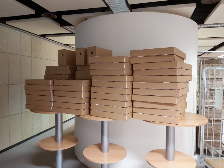 Intussen weten ze in het Rijksarchief Gent ook wat gedaan: bij hun vertrek hadden de blokken charters een totale omvang van ongeveer 23 strekkende meter. Zoals te zien is op de foto’s, zijn het er in hun nieuwe jasje heel wat meer geworden… Archieftetris voor gevorderden, maar magazijnverantwoordelijke Jurgen (in Gent ook bekend als McGyver) weet gelukkig van aanpakken.
