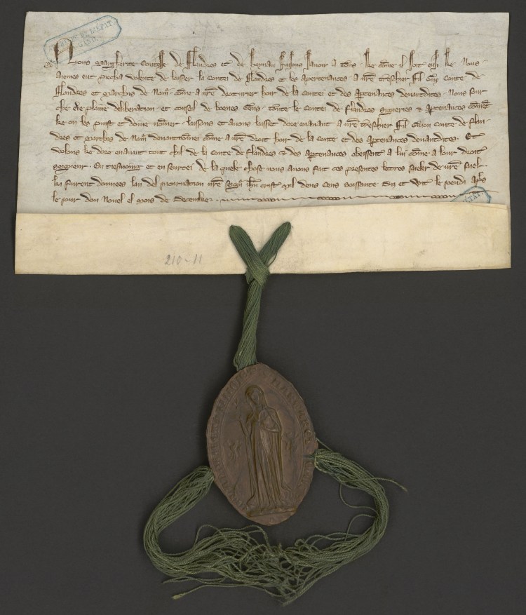 De oorkonde die deze belangrijke politieke beslissing markeert is één van de topstukken uit de collectie Charters van de Graven en Gravinnen van Vlaanderen (fonds de Saint Genois) die in het Rijksarchief Gent wordt bewaard. Het stuk verkeert in zeer goede materiële staat en ook het zegel van de gravin, gemaakt van bruine was hangend aan een staart van groene zijde, is intact gebleven.