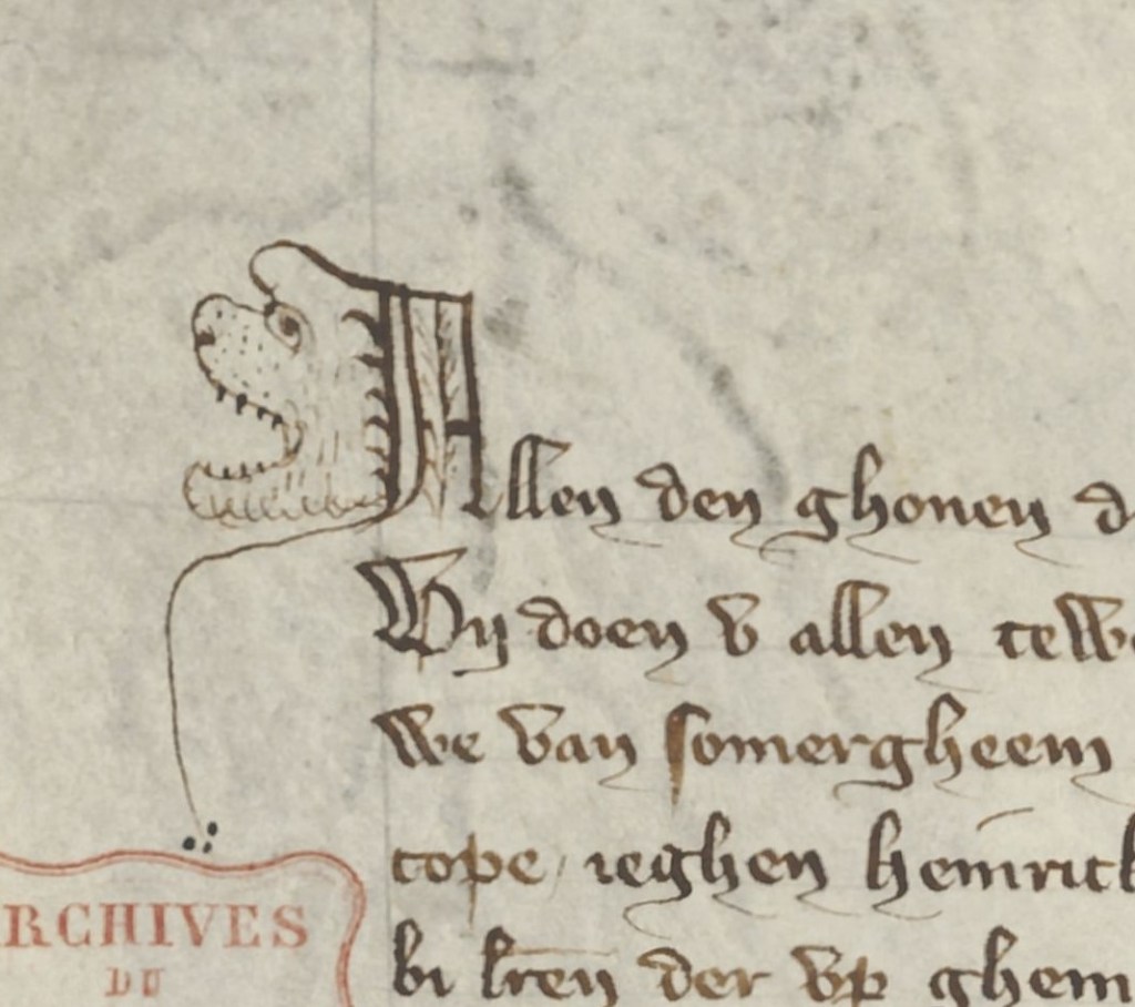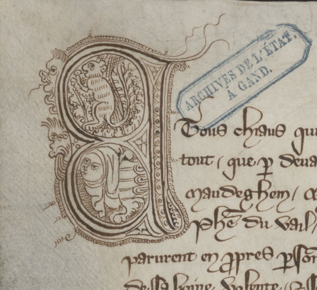 In Rijksarchief Gent zijn er in de collectie charters van de graven en gravinnen van Vlaanderen hier en daar afbeeldingen van dieren terug te vinden. Hoewel deze collectie hoofdzakelijk juridische en administratieve documenten betreft en geen gedecoreerde pronkstukken, zijn er hier en daar toch pareltjes van middeleeuwse iconografie terug te vinden. Dit kan zijn in de vorm van een gedecoreerde initiaal in de aanhef van een akte, een zegel met bijzondere afbeelding of een opvallend notarismerk.
